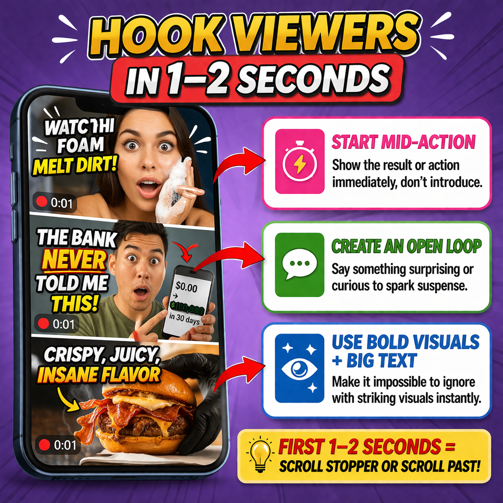 1. Hook Viewers in 1–2 Seconds: The first frame decides whether a viewer stays or scrolls. Opening mid-action or with a bold claim forces immediate attention before the brain registers the skip option.